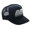 GAT Sport trucker hat. Features embroidered GAT Sport logo, fabric front panel & mesh back panel with plastic snap & adjustable closure.