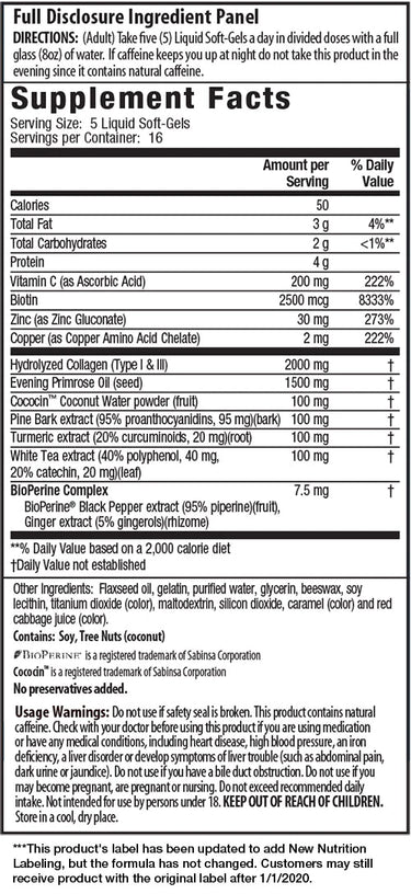 Collagen Beauty delivers nourishment for your skin and nails, including 2,500 mg of VERISOL® Collagen Peptides, Biotin, Gotu Kola, antioxidants such as CoQ10 and Resveratrol, as well as a variety of nourishing Omega Oils including Moroccan Argan Oil and Apricot Kernel Oil.* This product can be used daily to improve skin appearance and strengthen nails.